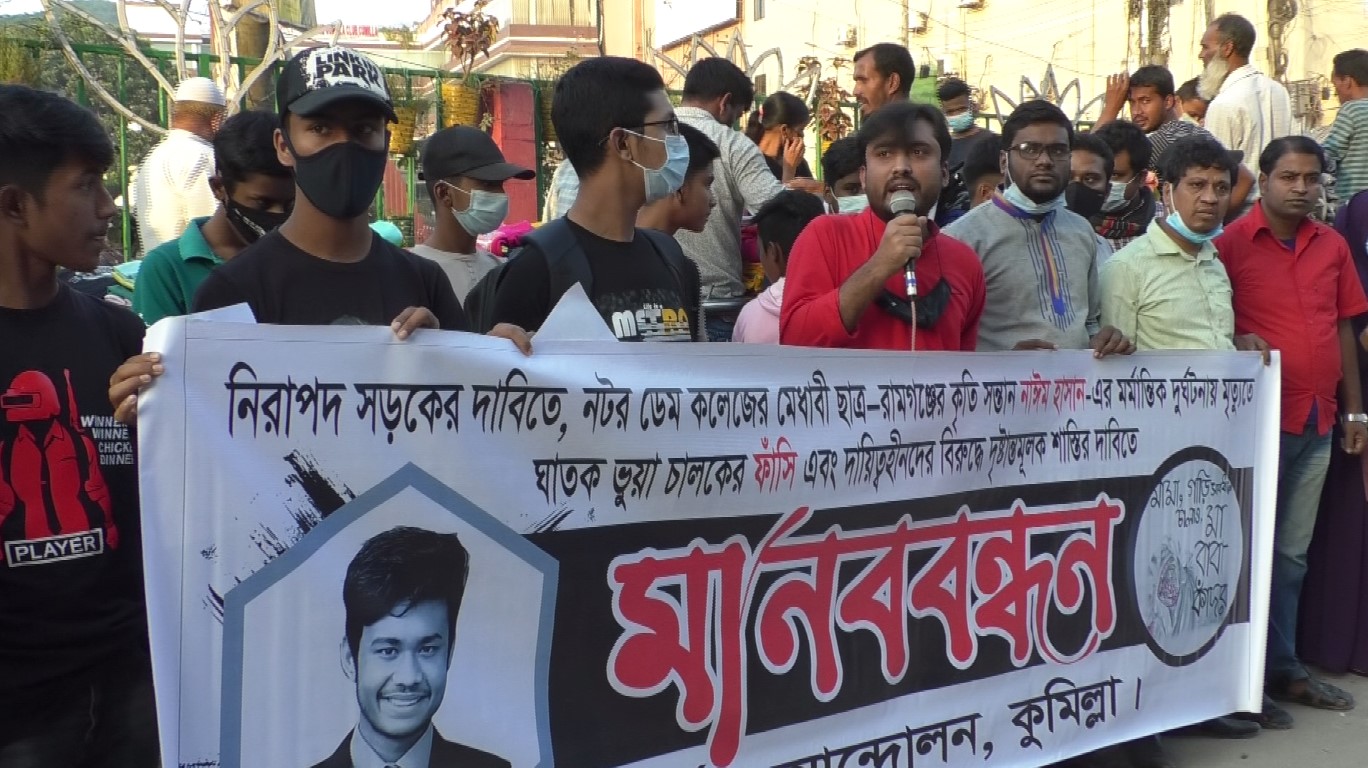 ঢাকায় মর্মান্তিক দুর্ঘটনায় নটরডেম কলেজের শিক্ষার্থী নাঈম হাসানের মৃত্যুতে ঘাতক চালকের ফাঁসি, দায়িত্বহীনদের বিরুদ্ধে দৃষ্টান্তমূলক শাস্তি ও সড়ক নিরাপত্তার দাবি জানিয়ে মানববন্ধন করেছে কুমিল্লার বিভিন্ন কলেজের শিক্ষার্থী, এবং কুমিল্লার বিভিন্ন সংগঠনের নেতৃবৃন্দ ও সদস্যরা।