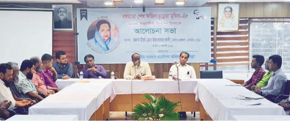 বঙ্গমাতা বেগম ফজিলাতুন্নেছা মুজিব এর ৯২তম জন্মবার্ষিকী উপলক্ষে নির্বাহী প্রকৌশলী দপ্তর,এলজিইডি কুমিল্লা জেলার কামরুল ইসলাম সিদ্দিক মিলনায়তনে আলোচনা সভার আয়োজন করা হয়। আলোচনা সভার সভাপতিত্ব করেন কুমিল্লা জেলার সুযোগ্য নির্বাহী প্রকৌশলী মীর্জা মোঃ ইফতেখার আলী। সভায় দপ্তরের সিনিয়র সহকারী প্রকৌশলী, সহকারী প্রকৌশলীবৃন্দ, হিসাব রক্ষক,উচ্চমান সহকারী সহ বিভিন্ন প্রকল্পের কর্মকর্তা-কর্মচারীবৃন্দ উপস্থিত ছিলেন। সভায় বঙ্গমাতা শেখ ফজিলাতুন্নেছা মুজিব এর জীবনী স্মৃতিচারণ করা হয়। সভার শেষ পর্যায়ে নির্বাহী প্রকৌশলী সমাপ্তি বক্তব্য প্রদান করেন এবং সভা শেষে বঙ্গমাতা শেখ ফজিলাতুন্নেছা মুজিব এর জন্মবার্ষিকী উপলক্ষে দোয়া পাঠ করা হয়।