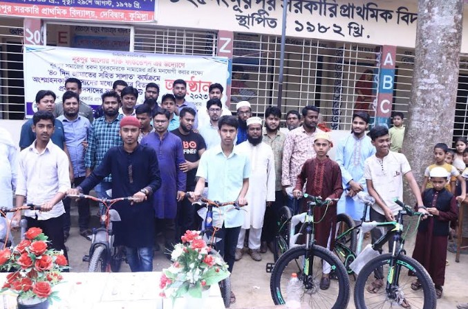শিশু-কিশোরদের নামাজের প্রতি আগ্রহ বাড়াতে পুরস্কারের ঘোষণা দিয়েছিলেন নুরপুর আলোর শক্তি ফাউন্ডেশন নামে একটি সামাজিক সংগঠন। সেই ঘোষণায় আকৃষ্ট হয়ে টানা ৪০ দিন জামাতে নামাজ পড়ে বাইসাইকেলসহ বিভিন্ন পুরস্কার জিতে নিয়েছে দেবিদ্বারের ২৭ শিশু-কিশোর। গত শুক্রবার দুুপুরে কুমিল্লার দেবিদ্বার উপজেলার ফতেহাবাদ ইউনিয়নের নুরপুর আলোর শক্তি ফাউন্ডেশনের এমন ব্যতিক্রমী উদ্যোগ সাড়া ফেলেছে পুরো এলাকায়। জানা যায়, কয়েকদিন আগে নুরপুর আলোর শক্তি ফাউন্ডেশন বিভিন্ন পাড়া মহল্লায় ঘোষণা দিয়েছিলেন যে, ১৫ বছরের কম বয়সের শিশু-কিশোররা যদি একটানা ৪০ দিন ৫ ওয়াক্ত নামাজ জামাতের সঙ্গে আদায় করে, তাহলে তাদেরকে একটি করে বাইসাইকেলসহ বিভিন্ন পুরষ্কার দেয়া হবে। সে ঘোষণায় উৎসাহিত হয়ে এলাকার অনেক শিশু-কিশোরই নামাজ আদায় শুরু করে। টানা ৪০ দিন নিয়মিত জামাতে নামাজ পড়েছেন, এমন ২৯ জনের মধ্যে ৫জনকে বাইসাইকলে ১৪টি ডিনার সেট, ১০টি নামাযের জায়নামাজসহ বিভিন্ন সম্মাননা ক্রেস্ট পুরষ্কার তুলে দেওয়া হয়।