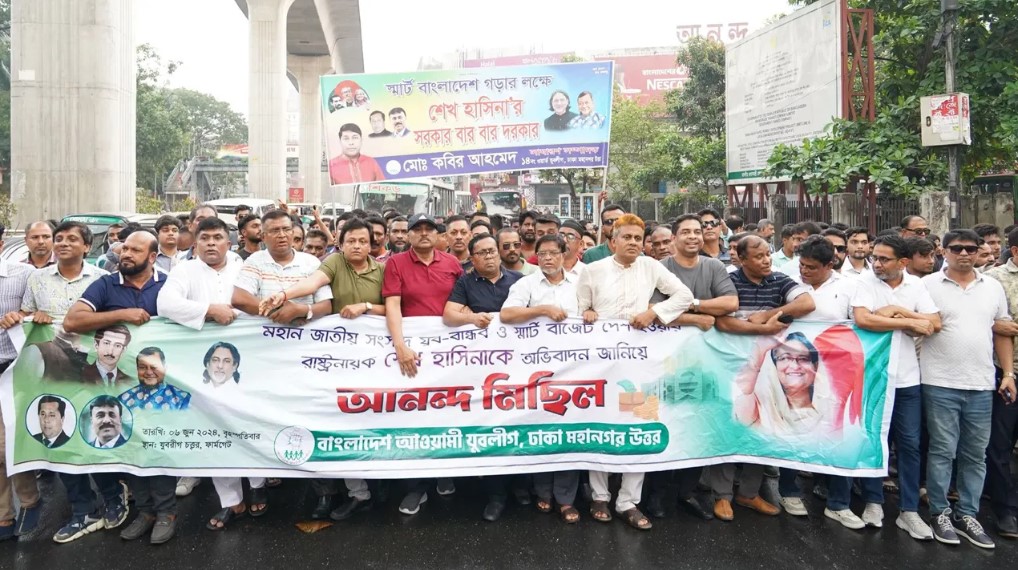 ২০২৪-২০২৫ অর্থ বছরের জন্য পেশ করা জাতীয় বাজেটকে স্বাগত জানিয়ে বাংলাদেশ আওয়ামী যুবলীগের চেয়ারম্যান শেখ ফজলে শামস্ পরশ ও সাধারণ সম্পাদক মাইনুল হোসেন খান নিখিলের নির্দেশে আনন্দ মিছিল অনুষ্ঠিত হয়েছে।