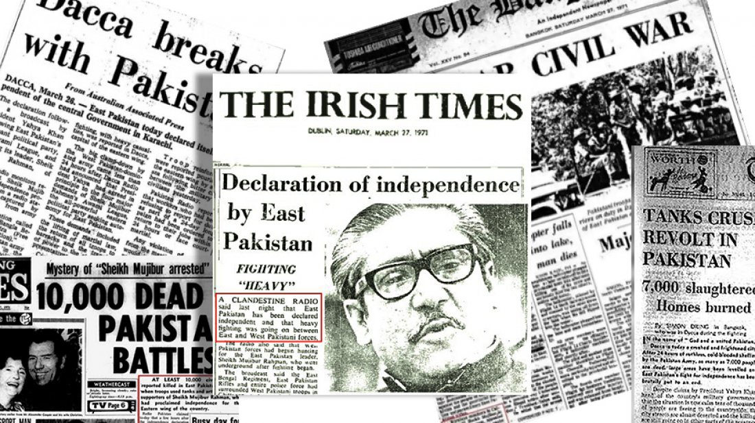 আয়ারল্যান্ডের দ্য আইরিশ টাইমস-এর শিরোনামেও ছিল পূর্ব পাকিস্তানের স্বাধীনতা ঘোষণা, আর সঙ্গে ছাপানো হয় বঙ্গবন্ধুর ছবি।