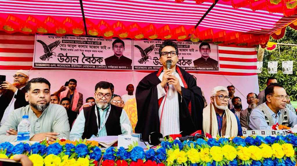 ঈগল পরিবর্তনের প্রতীক। ঈগলে ভোট দিলে গোমতী নদীর চর থেকে অবৈধ ভাবে বালু লুট বন্ধ হবে। সিএনজি-অটো থেকে জিবির নামে চাঁদাবাজি বন্ধ হবে। চারদিকে ঈগলের গণজোয়ার উঠেছে, আগামী ৭ জানুয়ারি ঈগল প্রতিক আপনাদের ভোটে বিজয়ী হবে। এতে শুধু নেতার পরিবর্তনই হবে না, নীতিরও পরিবর্তন হবে। ঈগল দেবিদ্বারে নতুন দিন নিয়ে আসবে। যারা বলছে জোর জবরদস্তি করে ভোট কেটে নিবে, ৭ জানুয়ারী ভোট বিপ্লবের মাধ্যমে তাদের বন্ধ করা হবে। শনিবার (৩০ ডিসেম্বর) বিকেলে উপজেলার ৬নং ফতেহাবাদ ইউনিয়নের কোটনা-নূরপুর এলাকায় এক উঠান বৈঠকে এসব কথা বলেন, কুমিল্লা- ৪ (দেবিদ্বার) আসনের স্বতন্ত্র সংসদ সদস্য প্রার্থী মো. আবুল কালাম আজাদ।