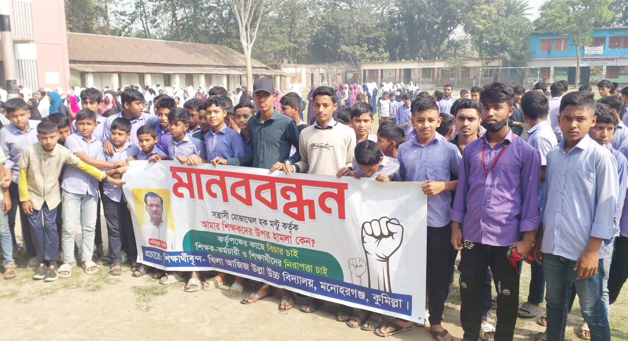 স্কুল নিয়ে স্থানীয়দের মাঝে বিরোধের জের ধরে কুমিল্লার মনোহরগঞ্জের খিলা আব্দুল আজিজ উচ্চ বিদ্যালয়ের প্রধান শিক্ষক মুনির আহমেদের সাথে অশোভন আচরণের প্রতিবাদে ও এর বিচার দাবিতে মাববন্ধন ও প্রতিবাদ কর্মসূচি পালন করেছে স্কুলের শিক্ষার্থীরা। বুধবার (১৫ জানুয়ারি) স্কুল ক্যাম্পাসের সামনে প্রতিবাদ ও স্কুলের সামনের সড়কে মানববন্ধন করে এ ঘটনার বিচার দাবি করে শিক্ষার্থীরা।