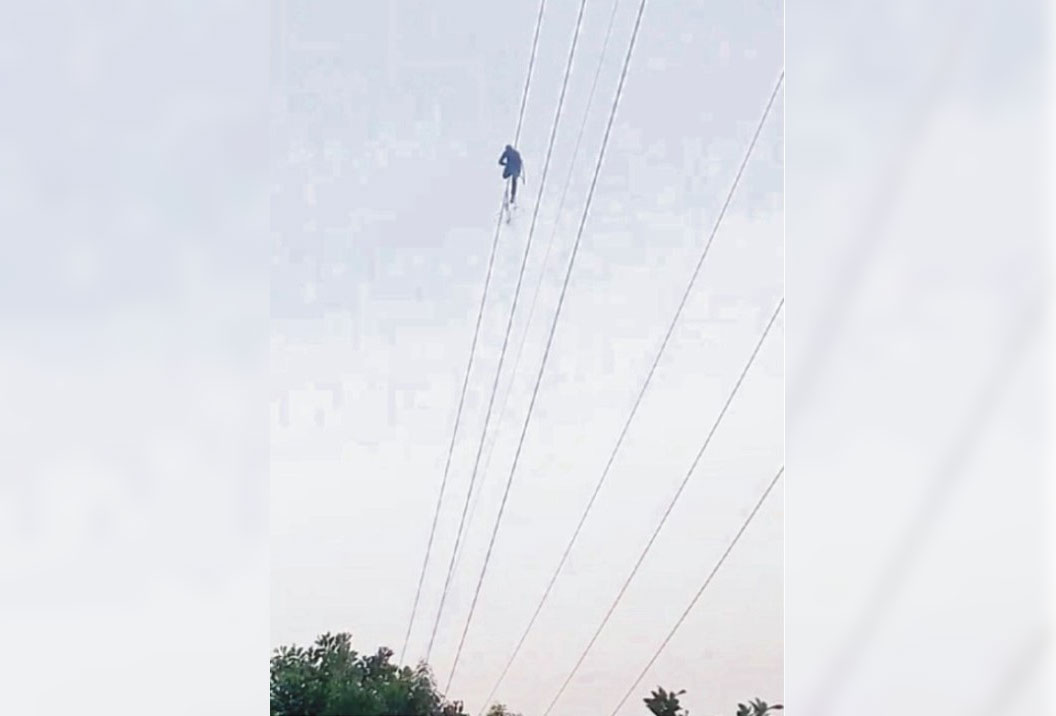 যায় এক যুবক। প্রায় ৬০ ফুট উচ্চতার বৈদ্যুতিক টাওয়ারে উঠে ওই লাইনের তারে