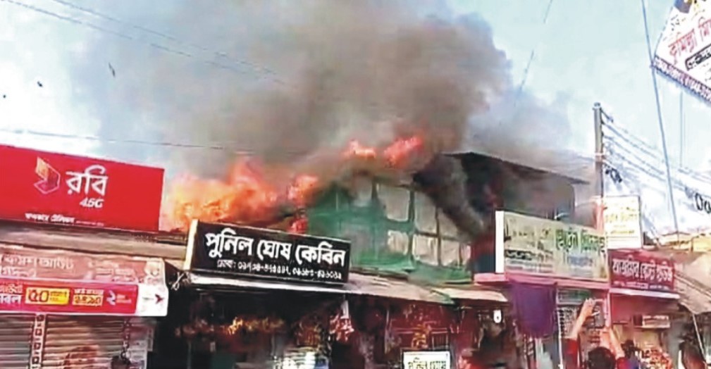 দিকে আগুনের সূত্রপাত হয়। মুহূর্তে আগুন অন্যান্য দোকানগুলোতে ছড়িয়ে পড়ে।