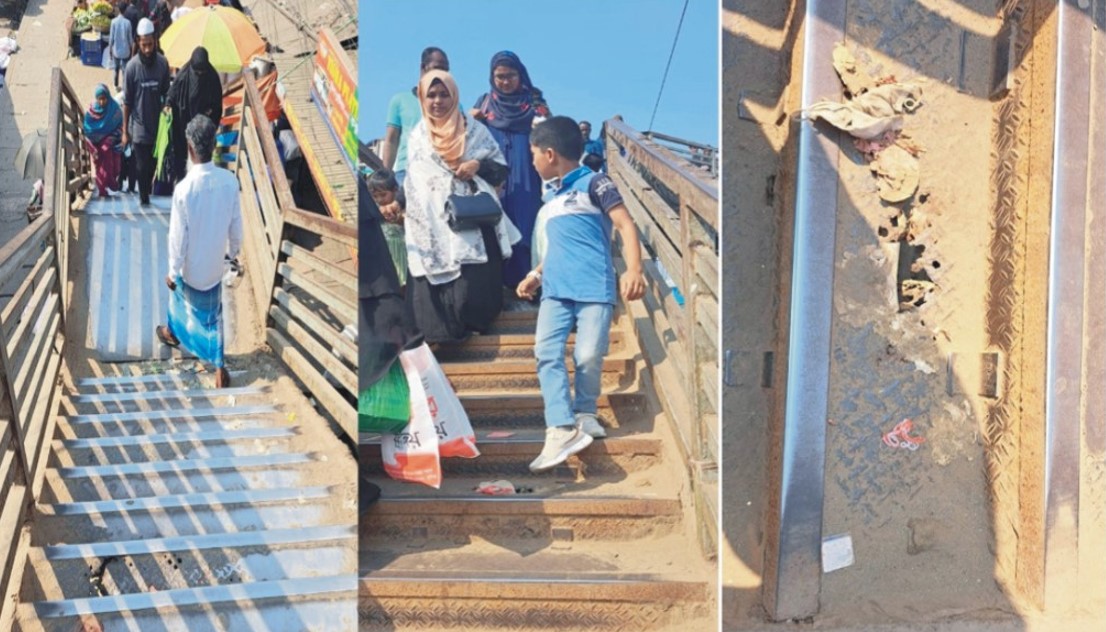 খোয়া যাচ্ছে। জরুরী ভিত্তিতে ফুটওভার ব্রিজটি মেরামতের জন্য পথচারীরা দাবী