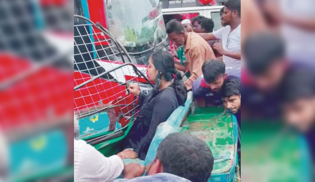 সিএনজি চালিত অটোরিকশাকে ধাক্কা দেয়। এতে সিএনজিটি দুমড়ে-মুচড়ে বাসের নিচে