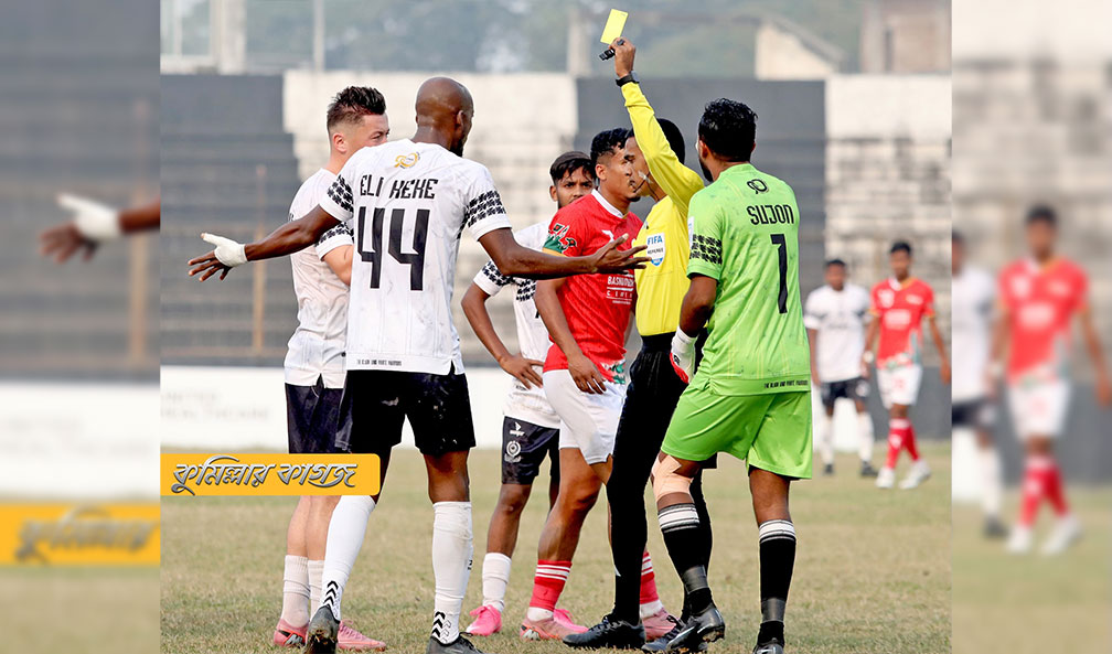 দেখেন হলুদ কার্ড। ফয়সাল আহমেদ ফাহিমের ফ্রি কিক বেরিয়ে যায় পোস্টের অনেকটা