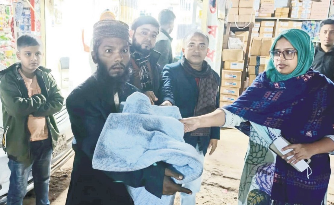 শীতবস্ত্রহীন মানুষের গায়ে কম্বল জড়িয়ে দেন। এ সময় অন্তত ১০০ জনের মধ্যে